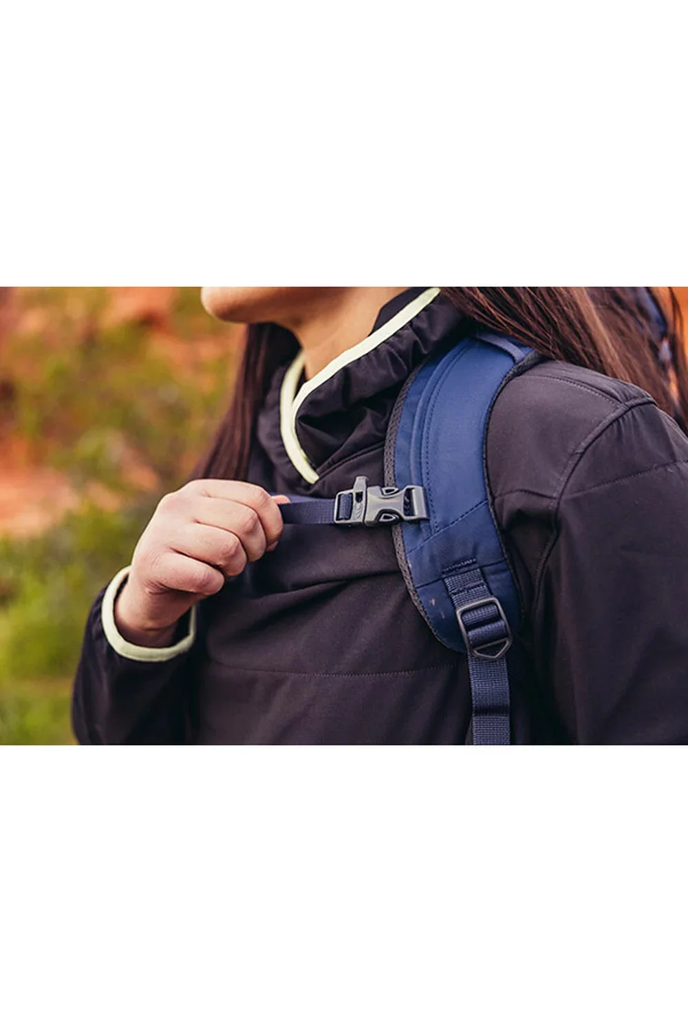 • Перфорирана, дишаща система от презрамки с гръден ремък и вградена сигнална свирка.